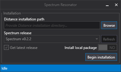 This method will use the official Spectrum setup utility called Resonator. To get it go to https://github.com/Ciastex/Spectrum/releases and click on the latest release title (currently Spectrum Stable 0.2.2). After loading the page, go to Assets at the bottom and download Resonator.zip. Open the file and extract its content. When the extraction is done, run Spectrum.Resonator.exe. The following window should appear: