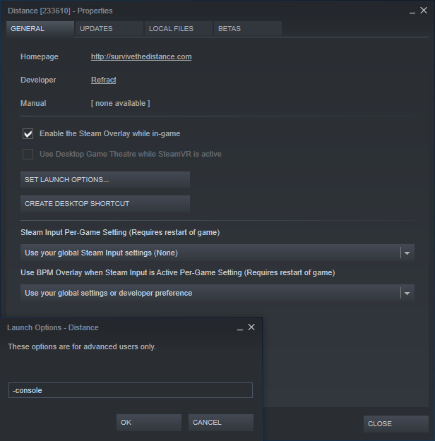 For this step, you will need to go to the steam properties for Distance by right-clicking the game in your library and go to Properties. In the General page, go to Set Launch Options and add -console at the end (add a space if other options were added before pasting it). This will enable the console and display debug messages as well as potential errors (which shouldn’t happen).